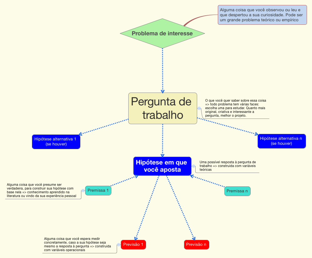 Depois de criada a pergunta, você precisará imaginar qual resposta espera encontrar para ela. A isso damos o nome de hipótese. Pense também em hipóteses alternativas, caso sua pergunta seja relativamente complexa. Depois de criar a hipótese, você precisará imaginar o que espera observar concretamente no seu sistema de estudo, supondo que sua hipótese é realmente a melhor resposta para a pergunta de interesse. A essa versão operacional da hipótese damos o nome de previsão. Perguntas complexas podem levar a mais de uma hipótese; hipóteses complexas podem levar a mais de uma previsão.