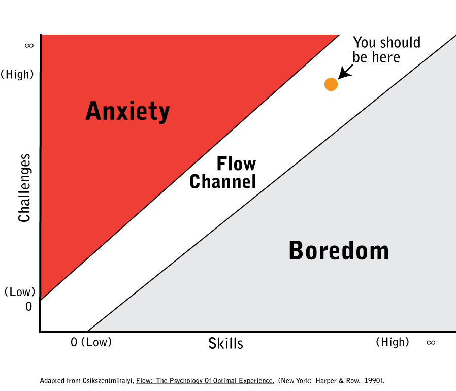 Funciona assim: se o nível de desafio for alto demais e suas habilidades estiverem em um nível baixo demais para dar conta deles, a tarefa se torna tão difícil a ponto de você sentir ansiedade; se o nível de desafio for baixo demais e suas habilidades estiverem em um nível alto demais, a tarefa se torna tão fácil que você sente tédio; mas se houver equivalência e a proporção certa entre desafio e habilidade, você alcança o estado de flow.
