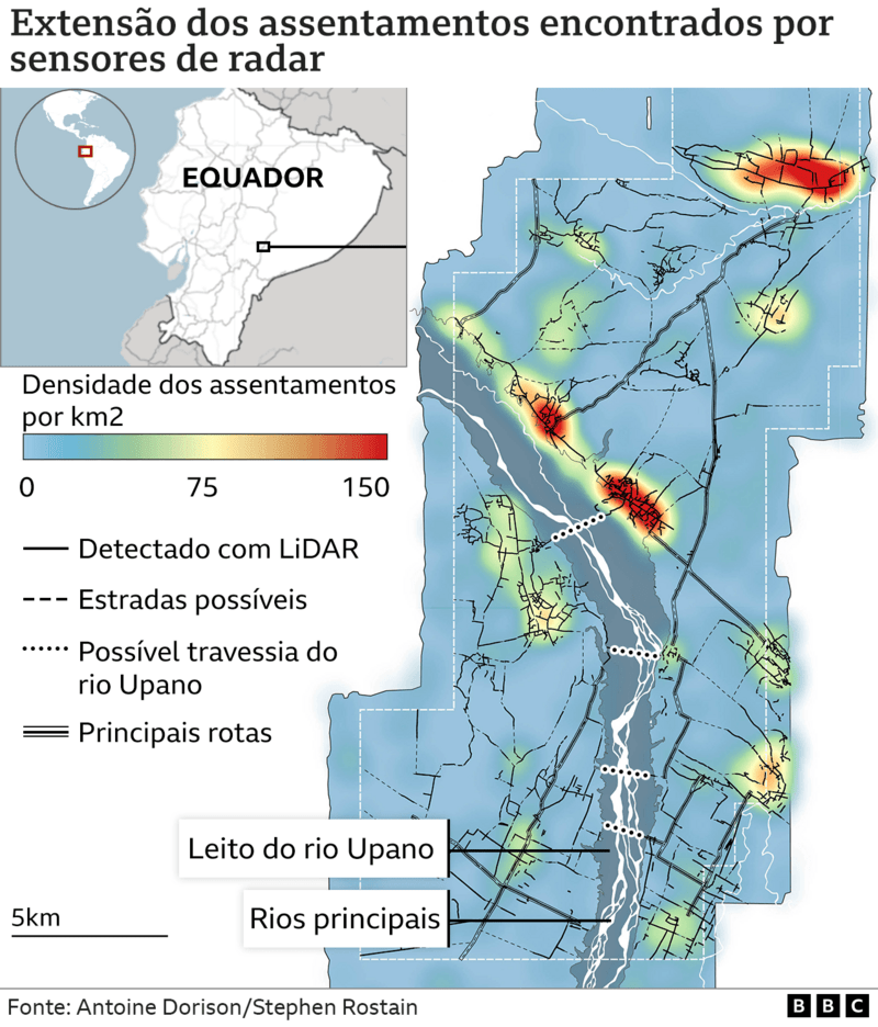 Após milhares de anos escondidas sob a densa vegetação, arqueólogos descobriram uma surpreendente rede de estradas, canais e cidades perdidas no meio da floresta amazônica do Equador que floresceram há mais de 2,5 mil anos. A região é conhecida hoje como os sítios arqueológicos do Vale do Upano.