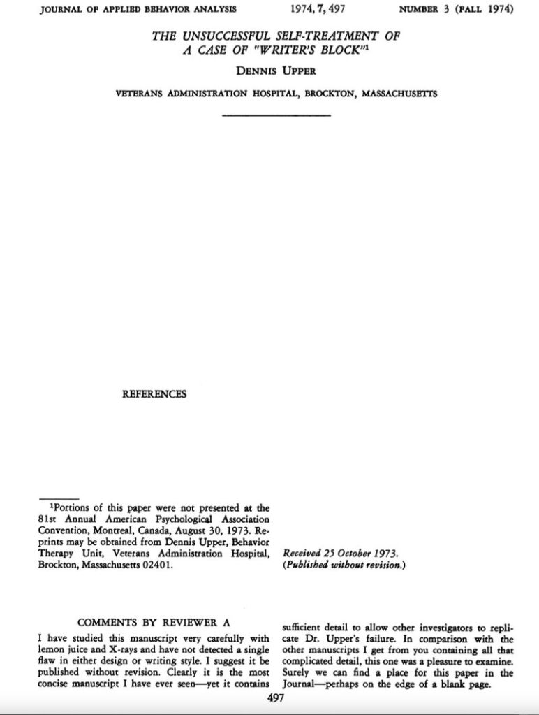 “The Unsuccessful Self-Treatment of a Case of Writer’s Block” é um artigo científico bem-humorado do psicólogo americano Dennis Upper sobre o chamado “bloqueio do escritor” ou bloqueio criativo. Publicado em 1974 em um periódico revisado por pares, o Journal of Applied Behavior Analysis, ele é reconhecido como o artigo acadêmico mais curto de todos os tempos, e um exemplo clássico de humor na ciência. Isso porque o artigo não contém conteúdo, exceto um título, elementos de formatação da revista e uma nota de rodapé bem-humorada.