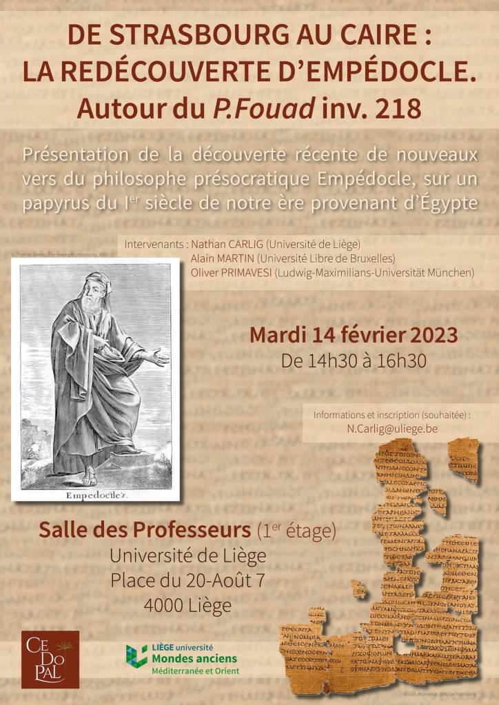 Referência bibliográfica: CARLIG, Nathan; MARTIN, Alain; PRIMAVESI, Oliver. (2025). L’Empédocle du Caire (P.Fouad inv. 218). Introdução, texto, comentário. Bruxelas, Association Égyptologique Reine Élisabeth.