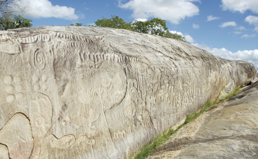 Inscrições rupestres de cerca de 6 mil anos na Pedra do Ingá, na Paraíba.